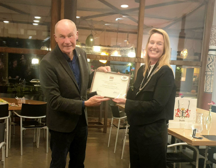Het Delftse Ondernemersfonds wordt bij de gemeente op waarde geschat en na mooie woorden vol waardering en afscheidscadeaus van o.a. Dingeman Leijdens (voorzitter Oondernemerfonds), Marja Keizer (fondsmanager) en Michiel van der Schaaf (directeur Delft Marketing) werd Jos aan het eind, als klap op de vuurpijl, dus verrast met deze erepenning.